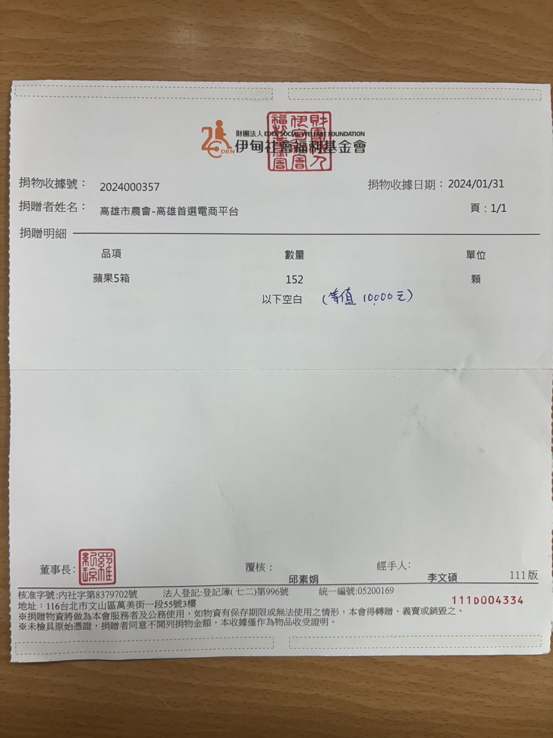 捐贈品項:年菜水果五箱(價值10,000元)