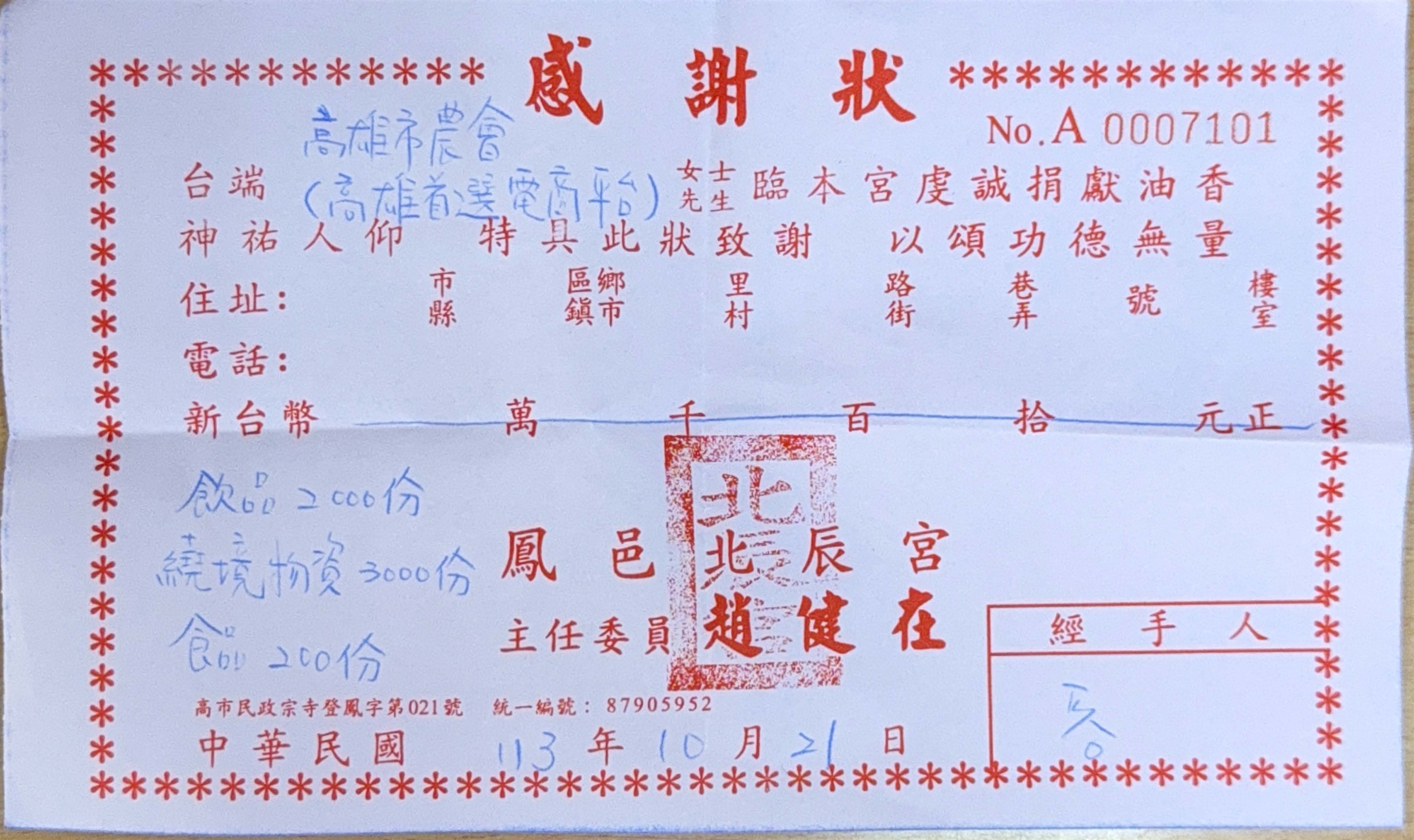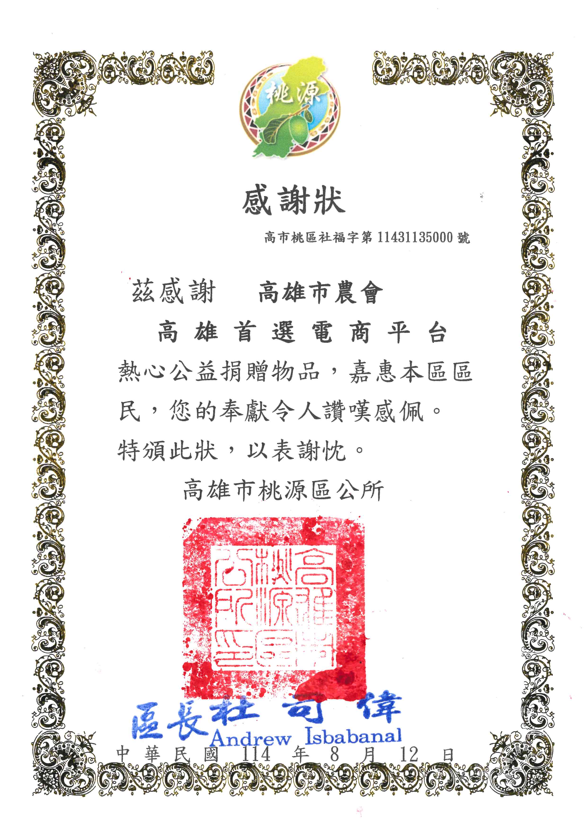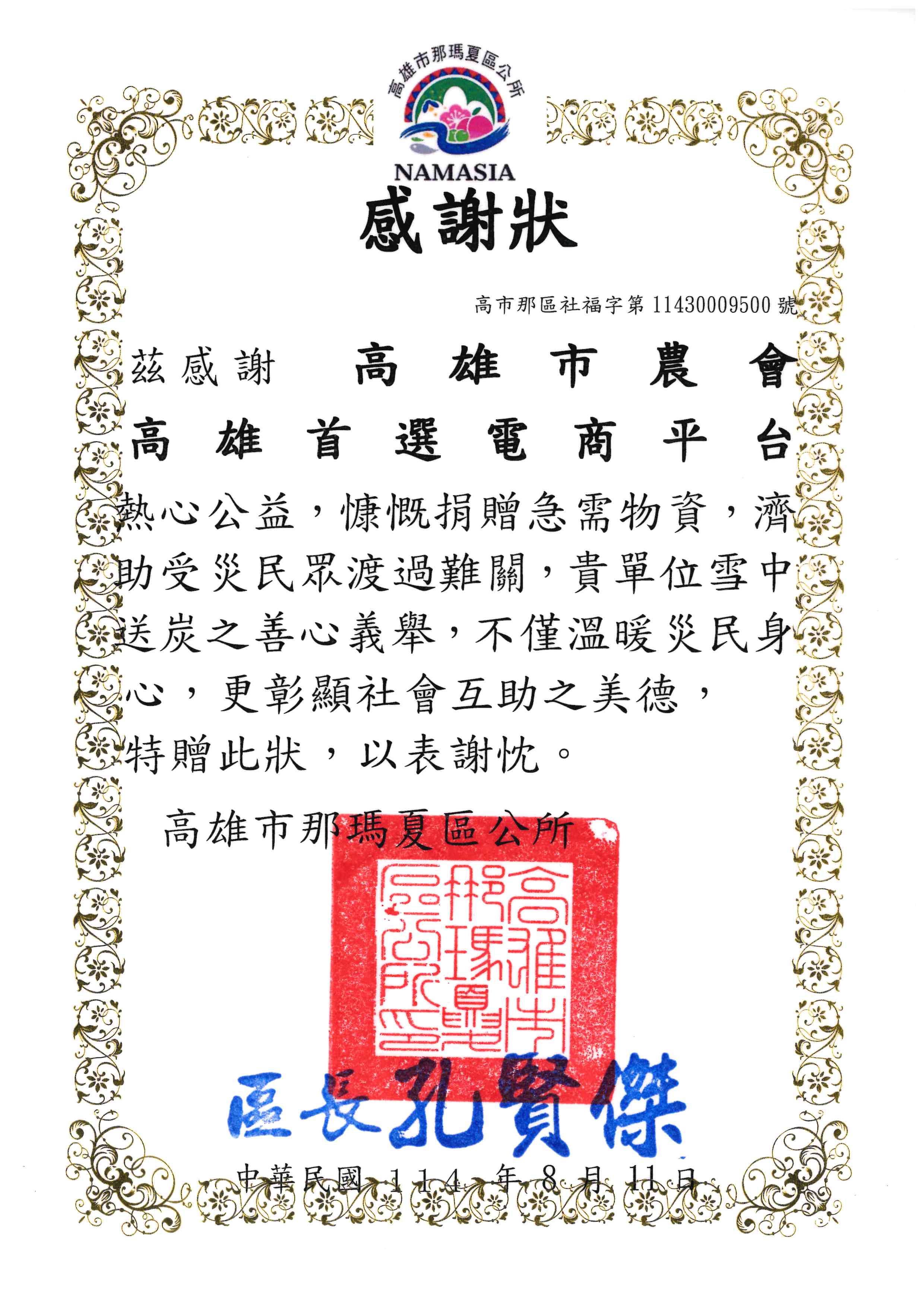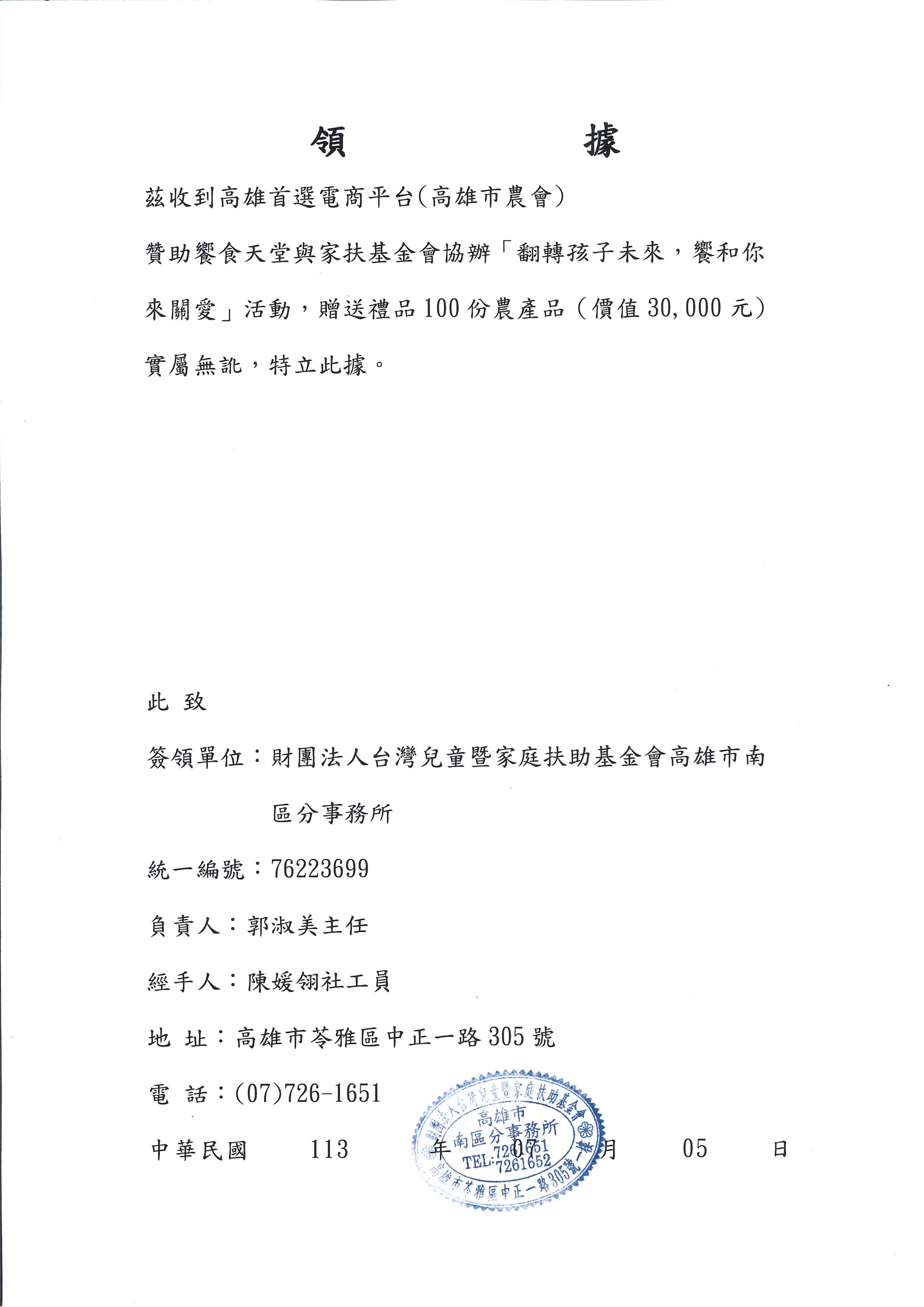 捐贈品項:高雄農產飲品食品乙批(價值2萬元)