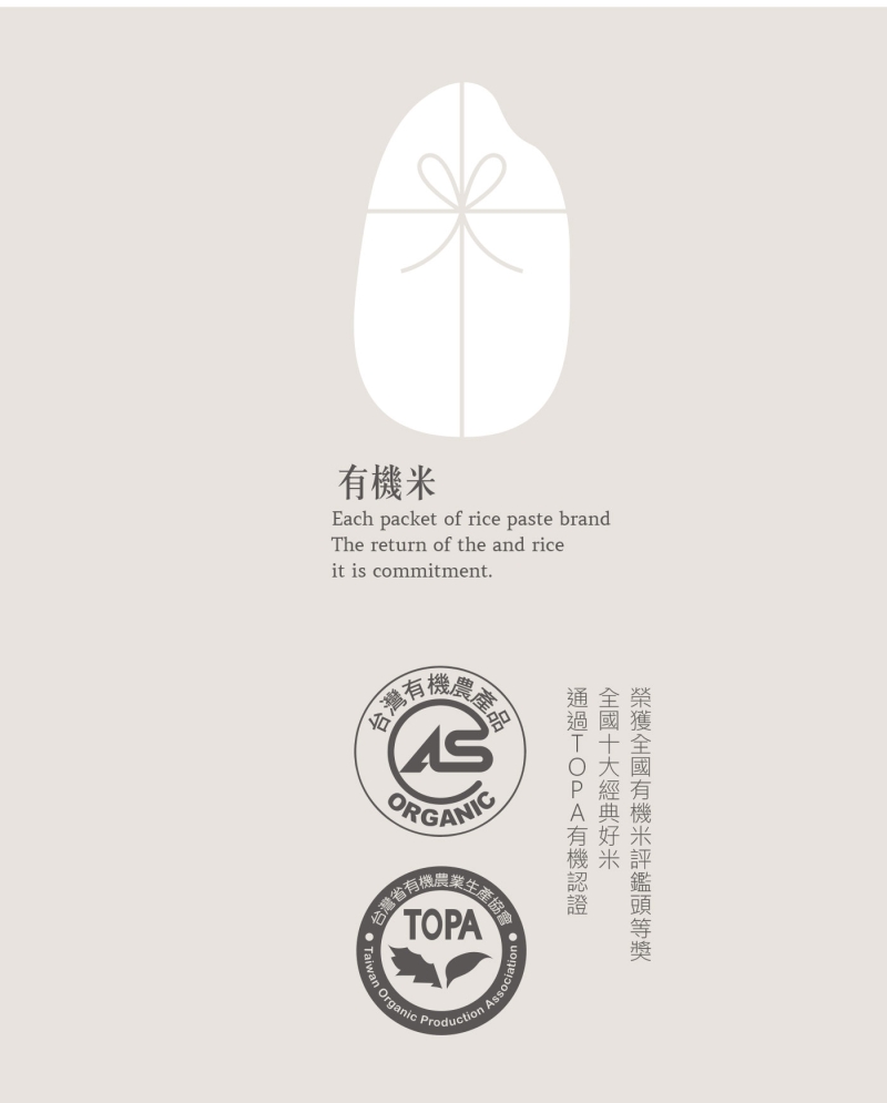 「守著土地、守著米」 碗中的每一粒米飯都是顆顆汗珠換來的 實實在在的冠軍好米,有著一家人對米食的執著, 和這片土地緊緊扣在一起。 以純淨自然安全生產、用傻勁、汗水滋養這片土地