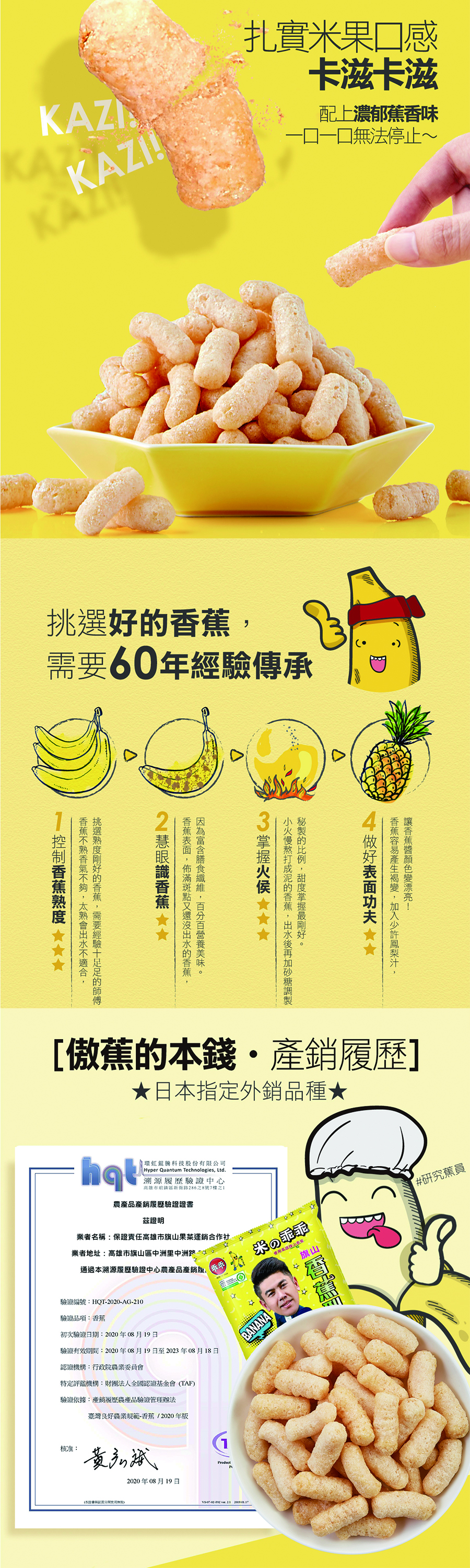 香蕉米乖乖有著扎實的米果口感,搭配用旗山香蕉製作的香蕉醬,完全不使用香料,