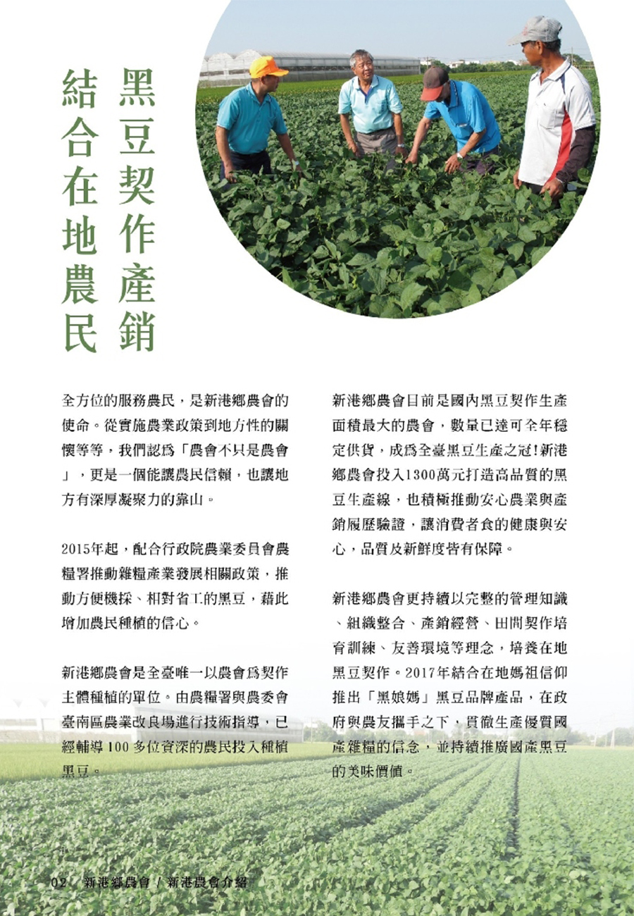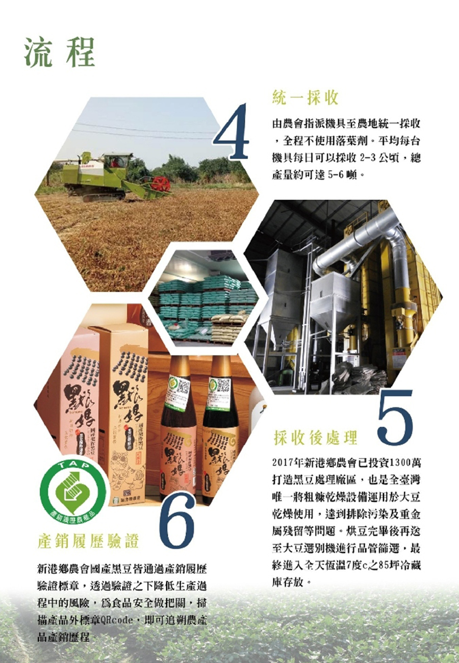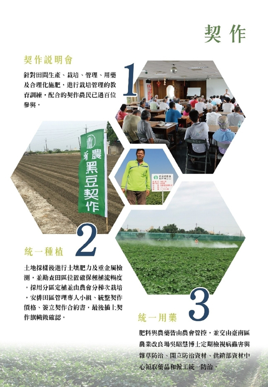 農會與農友契作本產非基因改造黑豆,契作模式採取統一播種、統一用藥、統一採收後送至農會集中乾燥、選別、定量包裝處理等作業模式,從土壤、水質到豆子都一再驗證,採收後則採低溫保存申請產銷履歷安全認驗證確保黑豆品質優良。