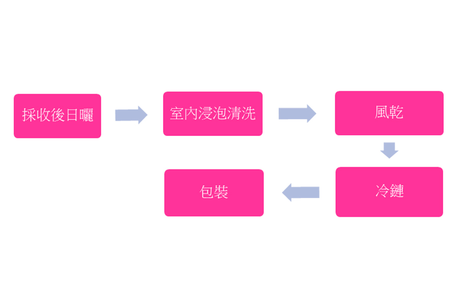 採收-日曬-多道清洗-脫水-室內風乾96小時-真空包裝20克乾藻是由600克生鮮在室內電力風乾96小時製成。