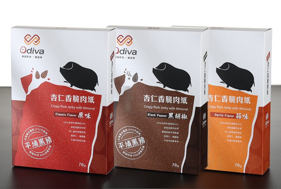 嚴選豬後腿,融合營養豐富的杏仁片,再以特殊技法烘製而成,蒜黑胡椒微辣口感,保留豬肉原獨有香氣再杏仁提味,酥脆的肉紙薄如蟬翼,咔滋咖滋的絕妙口感,最棒的味蕾享受。