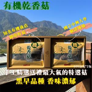 成分:有機乾香菇 品種:黑早 規格:100g±5g*2包(香菇直徑約5公分以上)*2個禮盒 禮盒尺寸:長43.5公分、寬18公分、高9公分有手提繩