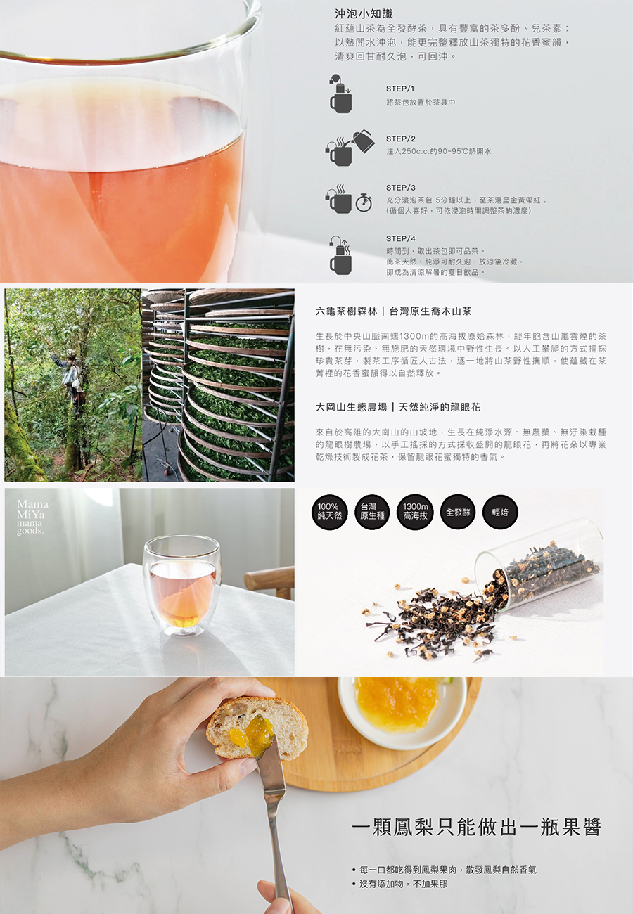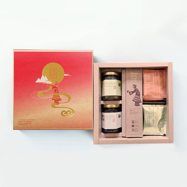 來自高雄大樹鳳梨青檸果醬、那瑪夏蜂蜜黃梅醬、大崗山龍眼花茶、六龜紅蘊山茶,高雄熱情產物美好一次饗受,附有禮袋送禮大方。